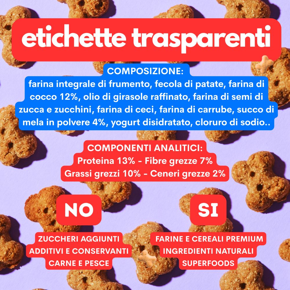 Vollkornweizenmehl, Kartoffelstärke, Kokosmehl 12 %, raffiniertes Sonnenblumenöl, Kürbis- und Zucchinimehl, Kichererbsenmehl, Johannisbrotmehl, Apfelsaftpulver, dehydrierter Joghurt, Natriumchlorid.