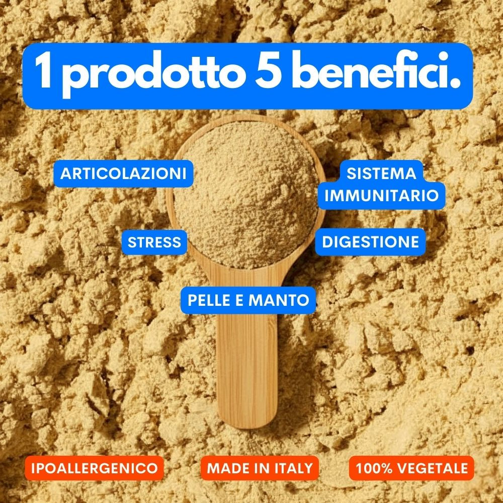 Questo integratore supporta il benessere quotidiano del tuo cane agendo su 5 aree di benessere grazie alla sua formulazione mirata.